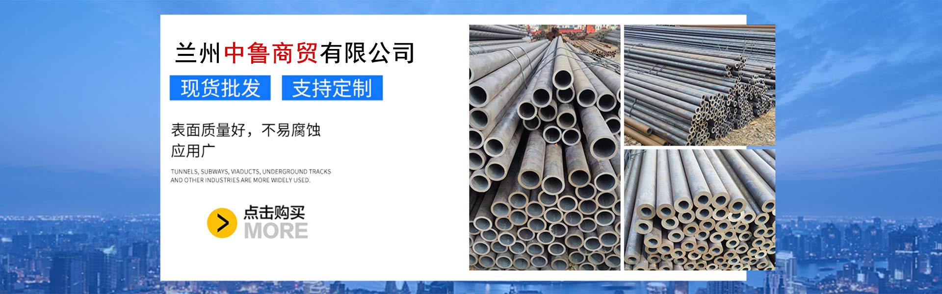 蘭州中魯商貿有限公司位于甘肅省蘭州市七里河區,優越的位置,便利的交通條件,是一家專業鋼材批發零售企業。公司主要經營攀鋼、寶鋼、包鋼、鞍鋼、天鋼生產的無縫鋼管;酒鋼、八鋼、石鋼生產的螺紋、線材、板材;安陽、包鋼、鞍鋼、邯鋼、唐鋼、萊鋼、日鋼所生產的角鋼、槽鋼、工字鋼、H型鋼及鋼軌等高質量高標準的產品。為客戶提供充足的貨源,滿足客戶多樣化需求,卓越,高效,全心是我們服務客戶的宗旨。多年以來始終如一,我們堅持為客戶考慮,為客戶解憂的服務理念,構建了專業完整的服務體系,形成了強大、新型的物流模式。現已形成已甘肅為核心,輻射陜、甘、寧、青、新、藏、乃至全國的區域化專業化銷售服務網絡。 以優質的貨物資源,全面的物流網絡,完善的服務體系,為客戶提供便捷、高效的服務體驗。憑借強大的綜合實力,我們多次服務于大型工程建設項目。我們始終秉承:質量是立身之本,信譽是發展之路,創新是基業磐石的經營理念。我們嚴格把控
